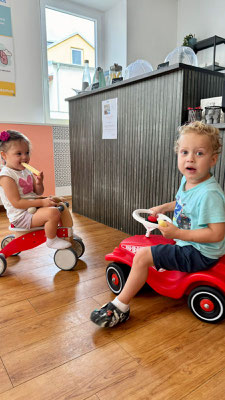 Eltern-Kind-Café mit einer Spielecke für die Kleinen und Indoor-Salzspielplatz.