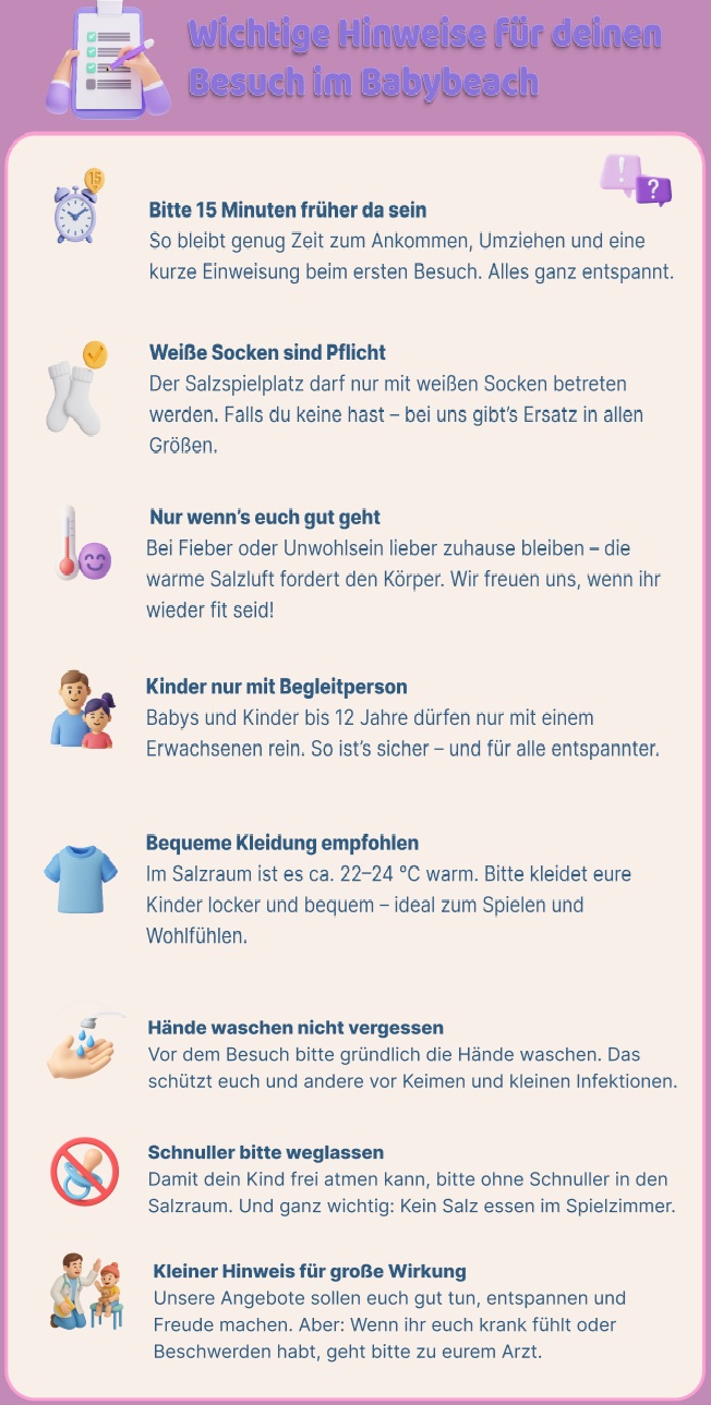 Jeder ist willkommen – vom Baby bis zum Erwachsenen. Die salzhaltige Luft kann von allen Altersgruppen als wohltuend empfunden werden. Während die Kleinen spielerisch ihre Zeit genießen, bietet der Raum auch Eltern und älteren Familienmitgliedern eine entspannte Atmosphäre.